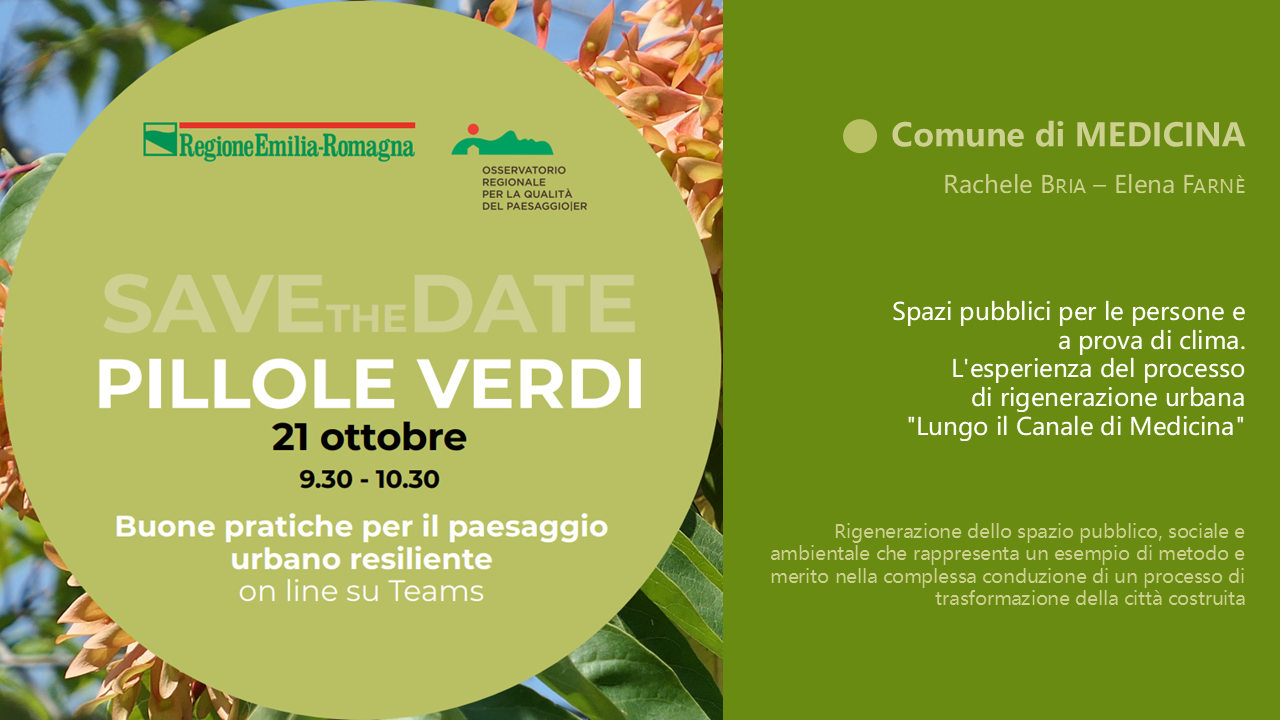 Si riparte da un progetto realizzato: un’ora dedicata ad una buona pratica di rigenerazione attenta ai temi ambientali, sociali, dello spazio pubblico, del microclima urbano. La rigenerazione urbana “Lungo il canale di Medicina”, in parte finanziata dal Bando RU18 della Regione Emilia-Romagna, trae forza dalla multidisciplinarità del gruppo di progettazione, dalla lungimiranza dell’Amministrazione comunale e dall’attenzione ai fabbisogni (espressi e taciti) della comunità.