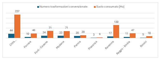 Rispetto alle previsioni contenute nei piani urbanistici generali elaborati con le precedenti leggi urbanistiche quelle convenzionate equivalgono a poco meno del 9%, mentre quelle decadute hanno risparmiato la trasformazione di 20.700 ettari di terreno agricolo.
