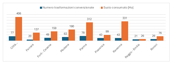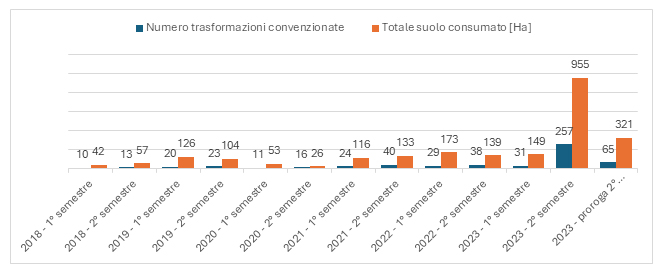 Nel complesso, dal 2018 al 3 maggio 2024 le Amministrazioni Comunali hanno approvato e convenzionato previsioni insediative che, se portate a termine consumeranno 2392 ettari.