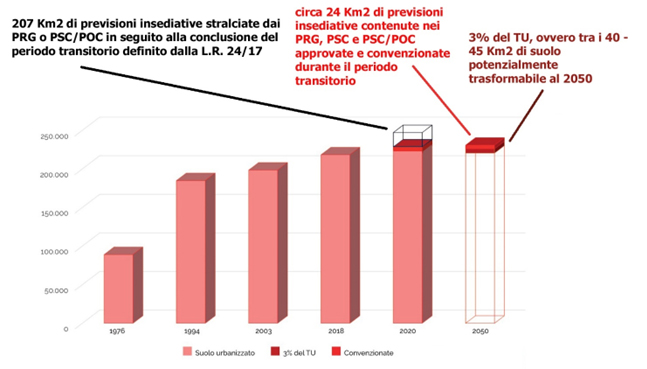 Si può, quindi, ribadire la rilevanza delle due principali innovazioni che la legge urbanistica ha introdotto - da un lato una significativa riduzione delle previsioni ereditate dalla pianificazione urbanistica previgente, dall’altro l’individuazione di una soglia quantitativa massima di suolo consumabile al 2050.